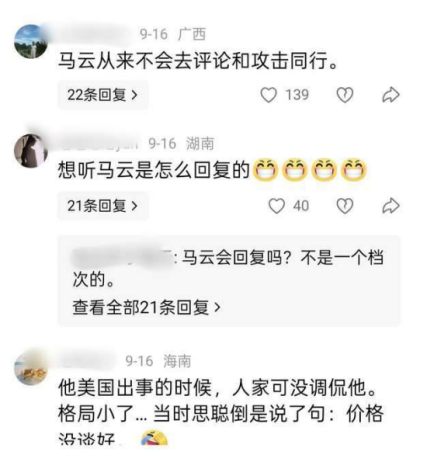 公开平台上,有网友直言,刘强东吐槽煤气灶是不是找马云买的,似乎有意在 " 拉踩 " 马云的某宝,假货太多。有人说:" 马云从来不会去评论和攻击同行。" 也有人说:" 他在美国出事的时候,人家可没调侃他,格局小了,当时王思聪倒是说句价格没谈好。"
