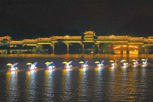 国庆、中秋假日期间,黔江区濯水古镇开展夜游阿蓬江活动,在阿蓬江上表演火壶、打铁花、花船巡游、水上飞人等项目,演绎了一场夜幕下的水上文化盛宴,吸引了众多游客前往观赏。特约摄影 杨敏/视觉重庆