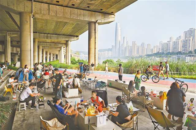 十月五日,江北区北滨路步道,市民正在休闲露营。国庆假期,市民在这里或骑行赏景,或休闲玩耍,在户外享受轻松惬意的假期时光。首席记者 龙帆 摄视觉重庆
