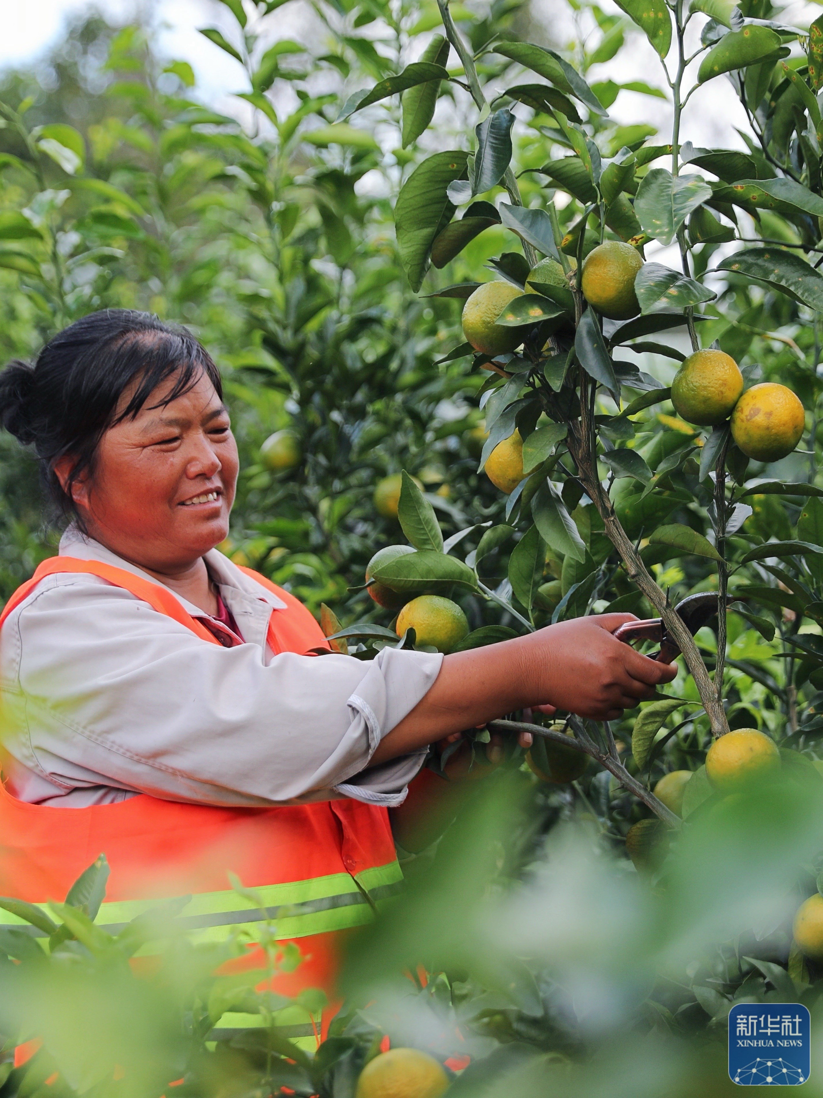 ↑ 10月30日,小湾东镇居民在合作社的果园里劳作。