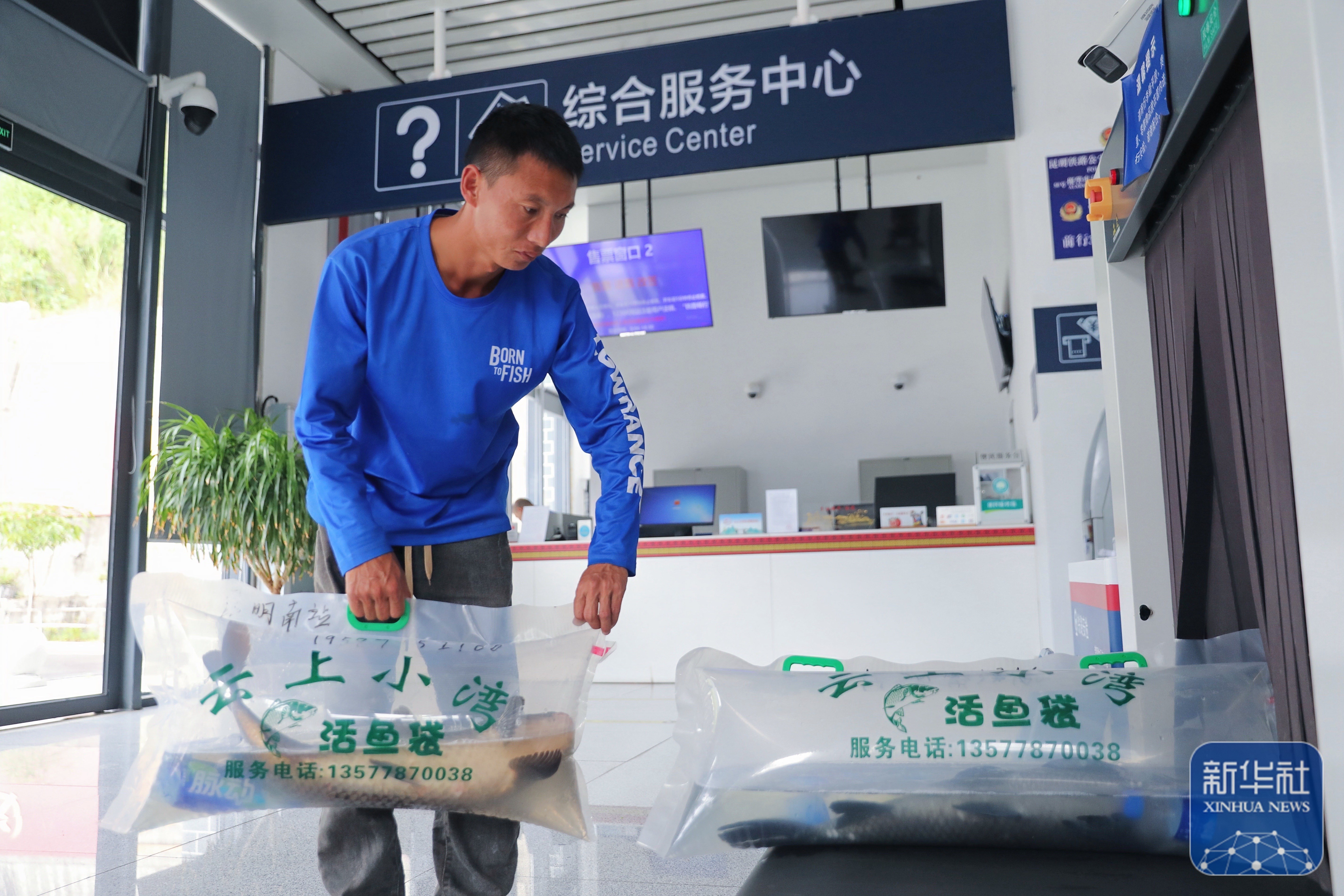 ↑ 10月31日,工作人员将装袋、加氧后的小湾东镇生态江鱼放上安检设备,准备通过高铁动车运往昆明。