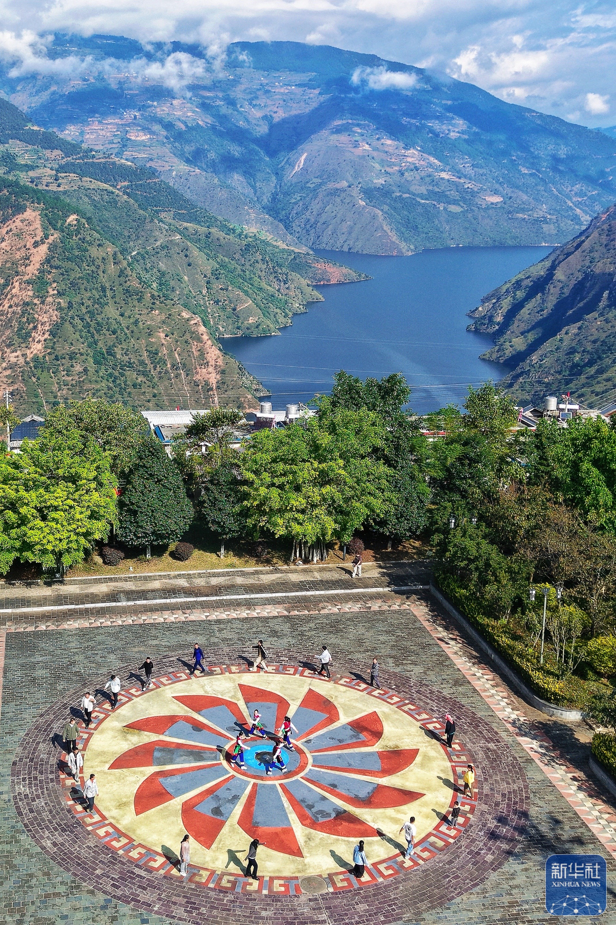 ↑ 10月31日,小湾东镇居民在澜沧江畔的移民广场休闲(无人机照片)。