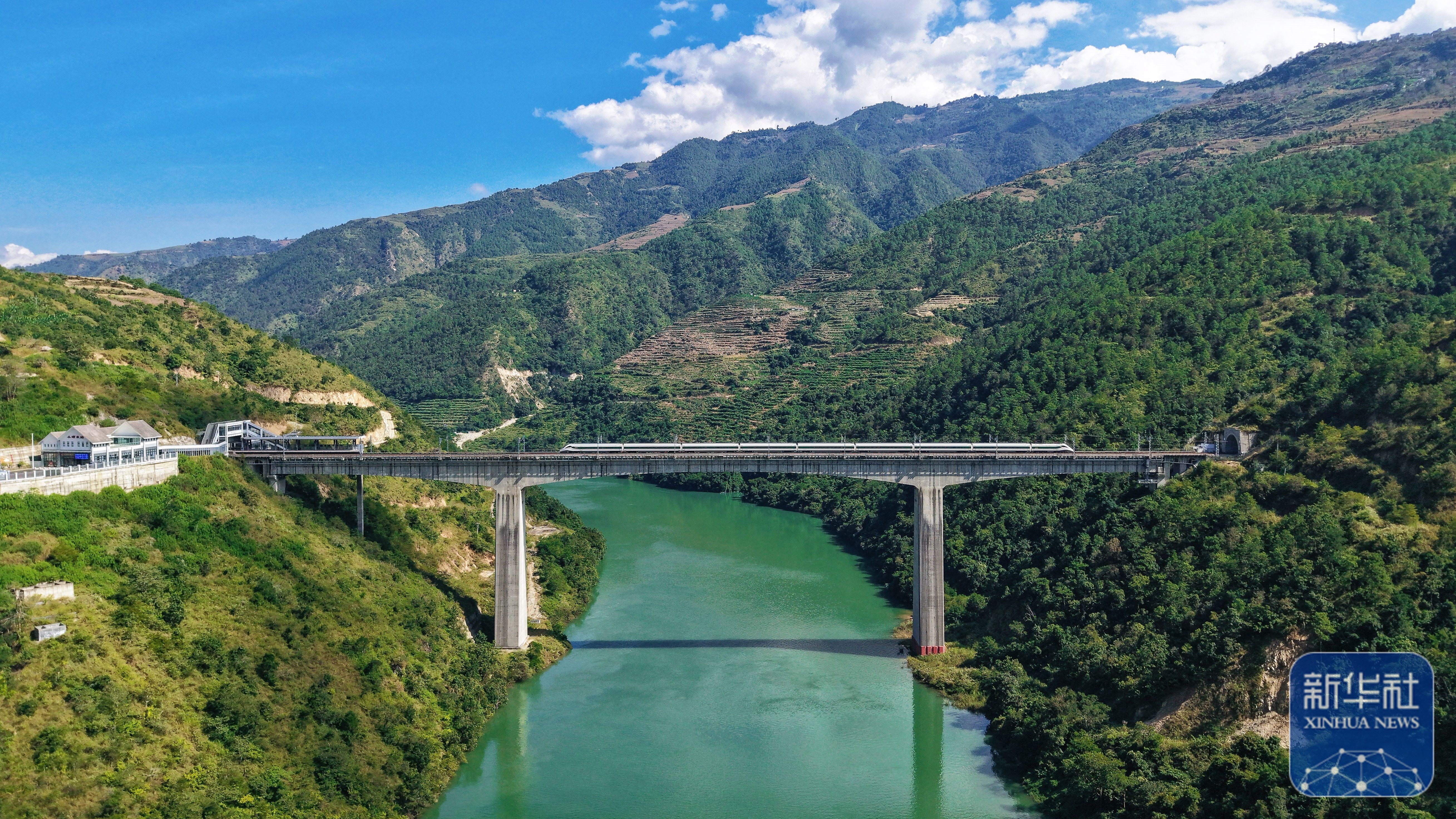 ↑ 10月30日,一列动车组列车经过小湾东站(无人机照片)。
