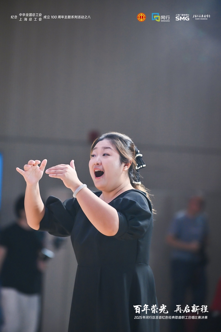 今天的决赛现场,一曲曲红色经典焕发新的时代光彩。从《我爱你中国》的深情告白,到《唱支山歌给党听》的真挚倾诉,从《在希望的田野上》的美好憧憬,到《祖国不会忘记》的豪迈誓言……从三尺讲台到工厂车间,从服务窗口到科研一线,来自闵行各行各业的职工们脱下工装,换上盛装,在舞台上绽放光彩。