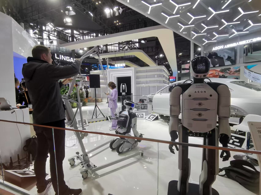 在“最硬核科技浓度超高”的技术装备展区,自然少不了机器人。海克斯康的AEON机器人是“明星展品”,这次来到第八届进博会有两台,它们将轮流为观众表演如何给汽车“做体检”,能自动检测出样本汽车哪里有瑕疵。