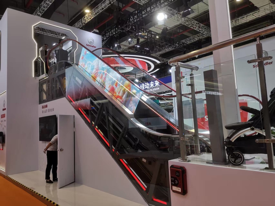 技术装备展区的很多展品,常常以“大块头”甚至“巨无霸”的形象吸引观众拍照合影。在4.1馆,迅达电梯就把一台自动扶梯搬进了展台,供观众现场体验,这是迅达电梯今年重点推出的“存量电梯焕新”解决方案。
