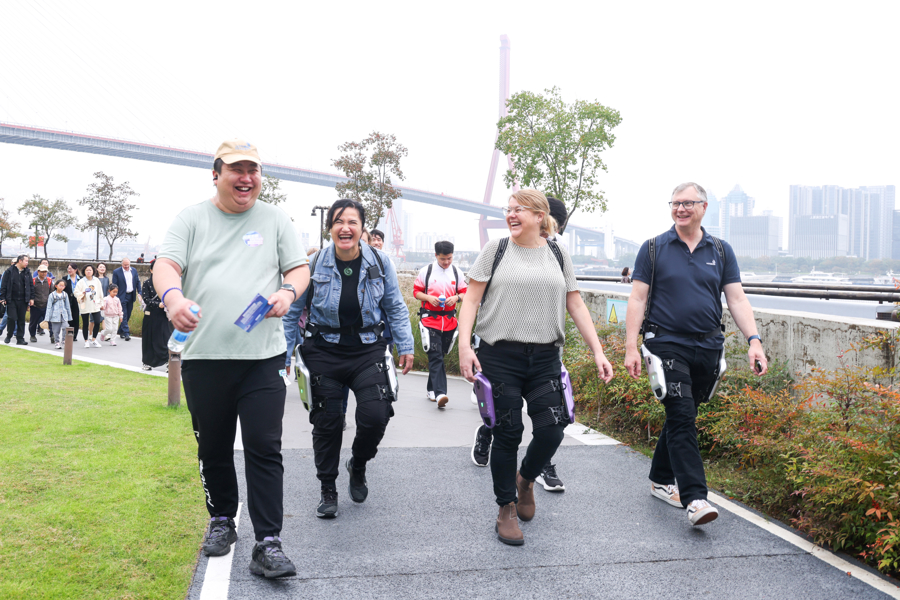 CityWalk中,世界技能组织、世赛梦想大使和博物馆联盟校等代表穿着由博物馆藏品捐赠方傲鲨科技提供的增程动力外骨骼机器人,他们健步如飞。大家也可在临展中进行体验和互动。