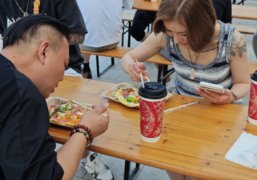 做了快20年蚵仔煎,张莺对于自己的出品非常自信:“你看我们的蚝多大、多新鲜,只要尝过的客人都是认可的。”从浦东赶来的老客人龚先生现身说法,“她做得确实好吃,我已经吃了七八年了。”假期最后一天,龚先生特地带着从澳大利亚回国的朋友李小姐一起到宝山滨江品尝美食,除了蚵仔煎,两人还买了旁边的串烤大鱿鱼和奶茶。