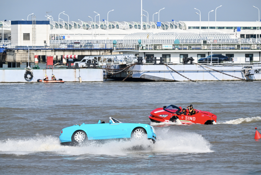 当一红一蓝两辆“水上汽车”飞驰而来,在江面疾驰漂移、激起千层浪,游客纷纷被其流线型超跑外观与强劲动力所吸引,举起手机录像。全国首创的“路亚艇+歌曲表演”更是让人惊喜不已。歌手赵天儿稳稳地站在艇上唱出动感的旋律,声光水影交织间,水上活力与艺术感染力碰撞出双重视听震撼。