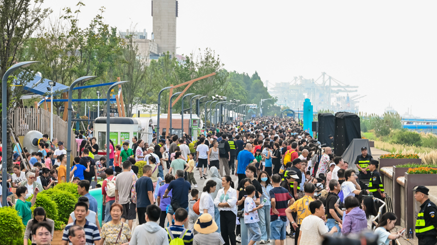 10月8日下午,记者在宝山滨江遇到了乔女士一家。他们在上海·海上世界商场平台区租了四人型休闲自行车,计划边骑行边观光,最后到北边的长滩观光塔打卡。租车行负责人告诉他们,要是前几天来,“江边的人更多,场面还要震撼。”
